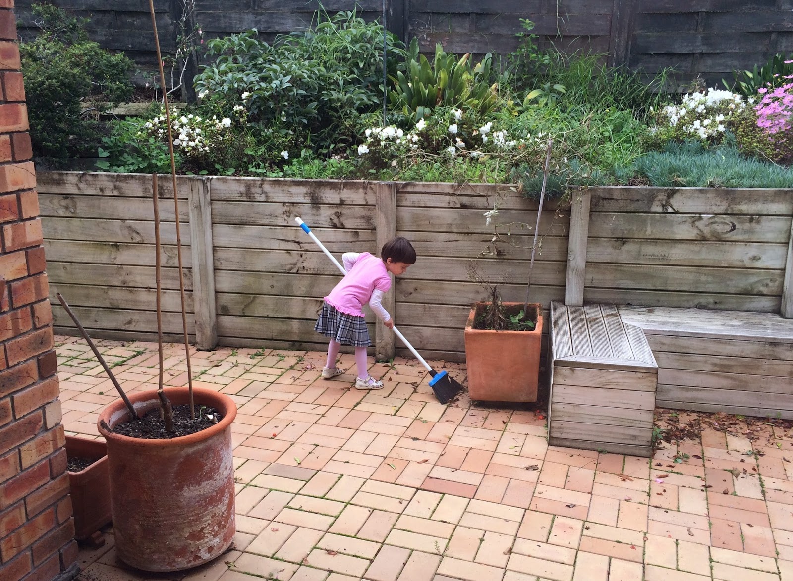 Наличие садика/огородика перед домом сподвигло детей копаться там в земле, лазать по лавочкам и пинать мячи на патио.
